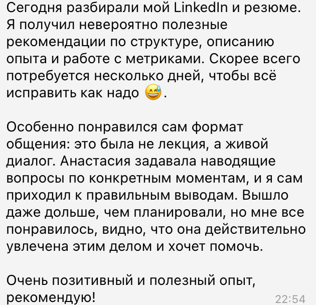 Писать тексты о себе сложно. После аудита я подготовлю CV и SEO-оптимизированный LinkedIn: переведу с технического на человеческий, выделю метрики и результаты